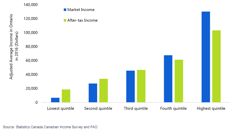 一项试点是否有意义,不能只看试点的结果本身,还要看试点成功以后能不能推广。根据FAO(Financial Accountability Office of Ontario )的报告,2016年安省的收入收入相当平均。如下图所示,收入最低的1/5和第二个1/5的人口受惠于各种税务优惠和补贴,税后收入高于市场收入。第三个1/5的人口市场收入与税后收入基本持平。只有第四个1/5和收入最高 的1/5人口的缴税额超过了税务优惠和补贴。从收入分布分析,能够从省税中为基本收入做贡献的纳税人占全部纳税人的一半,而符合基本收入领取条件的至少占全部纳税人的20%。按照每一个基本收入领取人平均$4751的收益计算,安省每一年需要发放总额为96.63亿元的基本收入,而安省的一半纳税人需要为此平均每人额外缴纳1900元的省税,而且这还没有计算所有符合基本收入领取条件的人还要享受额外的药物和牙医福利。而中高收入人群需要自己购买或者通过公司购买这些福利。这些福利的花费还没有被记入上面基本收入的成本当中。