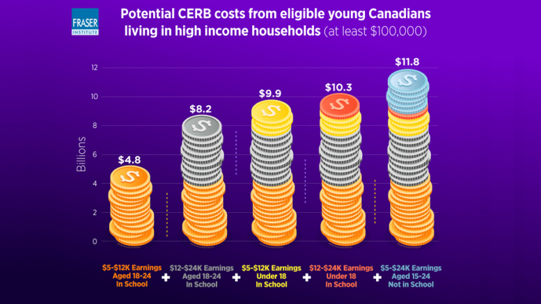 根据菲沙研究所报告,有40万名18-24岁仍与家庭收入10万以上的父母同住,2019年全年收入介于$5000与$12000加元之间的在校学生领取了每月$2000的CERB。这部分联邦政府CERB的总支出是48亿加元。而另外一组18-24岁28万7千3百名2019年全年收入介于$12000与$24000之间与父母同住的在校学生,也领取每月$2000的CERB。联邦政府为这一部分CERB的总支出是34亿加元。从这两组数字明显可以看出,CERB福利收入对于以上两组福利领取者大大多于他们在2019年同样24周中的总收入。福利收入大于工作收入,说明每一个人都收到同等金额的福利是一项可以被质疑的分配方式。