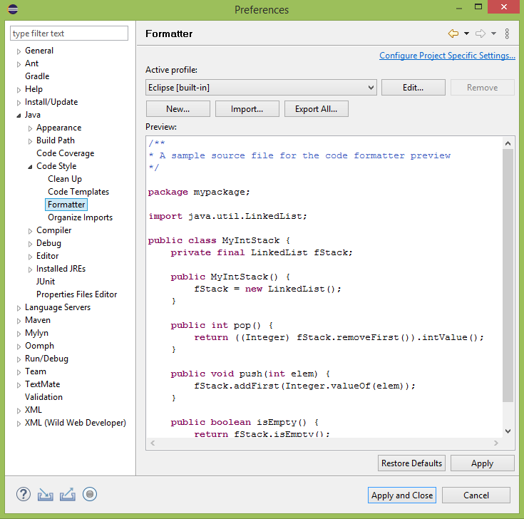 We have learned in Lesson 1 that the Eclipse IDE can help us automatically adjust the format of the source code. Simply press Ctrl + Shift + F to format the Java source code currently opened in the Editor. If you like to see more details about what the format template looks like, you can follow the following steps: from Eclipse main menu, Windows –> Preferences –> Java (from the left navigation column in the popup window) –> Code style –> Formatter.