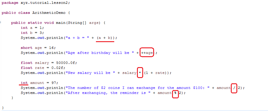The ArithmeticDemo class shows addition, multiplication, and division.