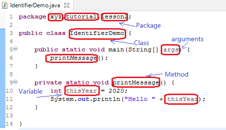 In the program above, “package”, “public”, “class”, “int”, “static”, “void” are keywords in the Java language, which have been assigned the specific meaning and syntax rules. Keywords are reserved for the Java language. A programmer cannot use the reserved keywords as identifiers. Other than the keywords in the program, the primitive date types “float”, “double”, “short”, “long”, “boolean”; control commands “while”, “do”, “for”, “if”, “else”, “switch”, “case”, “break”, “continue”, “try”, “catch” are all reserved for Java. You may not remember all of them at this moment. We will learn all these in future lessons of this tutorial series.