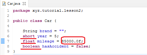 “year” represents the age of the car. It is declared as a “short” type. From the primitive data type table, we know that the short type is a 16-bit integer, the maximum positive value is 32767. A car cannot be older than 32767 years, so “short” type is good enough in this case. We are free to replace “short” with “int”. The “int” type is 32-bit. Since the maximum value of “int” type is huge (4.3 billion or so), No car can be the same age of the Earth. It is up to you to choose the type.