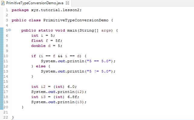 We can append “f” and “d” to specify the type of a number to be float or double. For example: 5f, 5.0d. A number can use ([type]) to convert from one type to another as long as it is allowed. For example: (int) 6.8 will convert a double type number 6.8 to an integer 6. This conversion does not round.