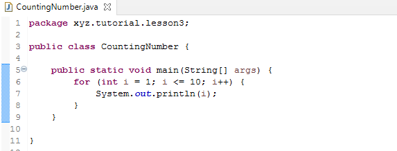 for (int i = 1; i <= 10; i++) { // } is a standard “for” loop. int i = 0; set the initial state of variable i. The expression i = 0 just like a regular assignment, assign an integer value 1 to the variable i. i++ is the step. After each loop, i++ is executed, which increases the value of the variable i by 1. After that step, the loop condition i <= 10 will be evaluated. If the condition met, then start executing the logic of the loop body enclosed in the curly bracket. If the loop condition doesn’t meet, the loop finished and the program moves on to process the next line.