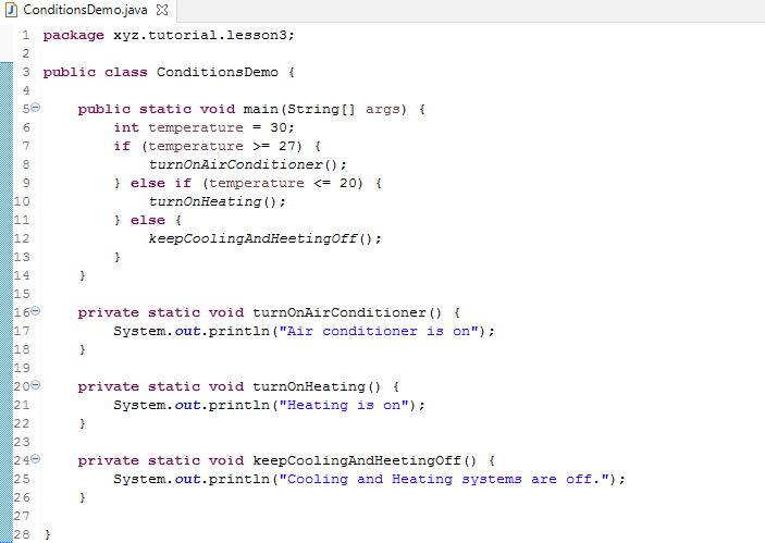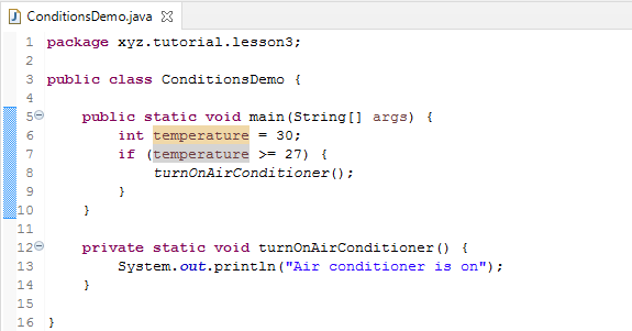 So, if the temperature has a value 27 or greater, then the code in a block enclosed in a pair of curly brackets is executed. In the example, turnOnAirConditioner() method is invoked.