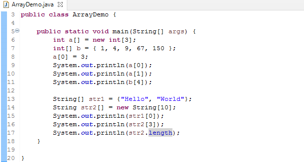 In the sample code, String str2[] = new String[10]; declare an array of type String with 10 elements. The values are not assigned during the initialization. We can access one of the elements by specifying the index. For example: str[3]