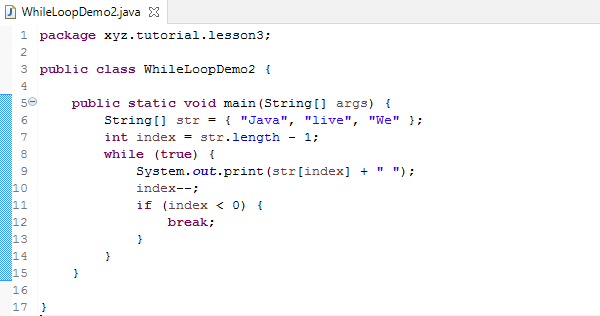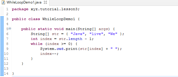 Unlike “for” loop, the “while” loop has neither initial state nor step. If we really need them, consider to use “for” loop instead. Or, we can set initial state and step separate from the “while” syntax. In the example, int index = str.length – 1; acts as setting the initial state. index–; acts as the step. In such a case, we can easily transform a “while” loop into a “for” loop.