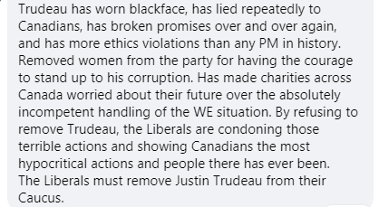 “特鲁多画过黑脸,反复向加拿大人民说谎,一次次违背承诺,在伦理上违规比加拿大历史上任何总理都多。把敢于站出来揭露他的腐败的妇女开除出(自由)党。他不称职地处理WE丑闻的方式使加拿大各地的慈善机构担忧他们的未来。通过拒绝罢免特鲁多,自由党纵容了这些可怕的行为,向加拿大人展示了有史以来最虚伪的行为和一群人。自由党必须从他们的核心小组中开除贾斯汀·特鲁多。”