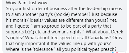 “Pam,(保守党)党领选举后你的第一项紧要工作是谴责另外一个政党的议员吗?就是因为他的道德观/理念/和价值观与你不同?当你说‘我非常骄傲是一个支持LGQ权利和妇女权利的政党成员’时,Derek的权利呢?全体加拿大人言论自由的权利呢?难道只有与你相同的价值观才是重要的?你们常常宣讲的“包容”在哪里?”