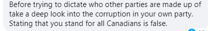 “在试图对其他政党指手画脚之前先深入看一下你自己政党的腐败。你把自己描述为代表全体加拿大人是假的”。