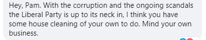 “Pam,鉴于腐败和不断发生的丑闻,自由党已经陷入困境,我认为您需要自己做一些房屋清洁工作了。管好你自己的事。”