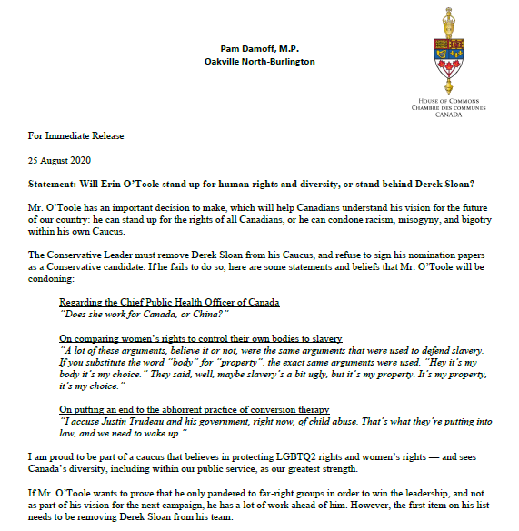 2020年8月24日凌晨,加拿大保守党选出了新任党领Erin O’Toole。一天后,Oakville North-Burlington的联邦自由党国会议员Pam Damoff发出声明,要求新任联邦保守党党领Erin O’Toole把联邦保守党的国会议员Derek Sloan开除出议会党团,并在下次联邦大选前拒绝签署Derek Sloan的提名文件(这意味着取消Derek Sloan的未来参选资格)。一个自由党议员要求保守党党领按照她 的要求做,干涉其他政党的内部事务,听起来难以置信。这项声明中罗列了Derek Sloan在角逐联邦保守党党领期间表达的三个立场:(1) 在Covid-19疫情刚发生不久质疑加拿大首席公共健康官是为加拿大服务,还是跟从中国?(2) 关于Derek Sloan在表达反堕胎立场时用词”body”, “property”,和”slavery”。Pam认为这样的用词轻视了女性。(3) Derek Sloan试图阻止儿童变性,谴责自由党政府的儿童变性政策是虐童。其中后两条观点来源于Derek Sloan的基督教信仰。Derek来自于耶稣复临会,一个从福音派教会中分离出来的教派。自由派和保守派的选民,不同的宗教信仰,会对Pam Damoff罗列的以上三条理由有不同的理解,这里不做评论。我提出的问题是,国会议员能否按照自己的价值观自由表达立场?