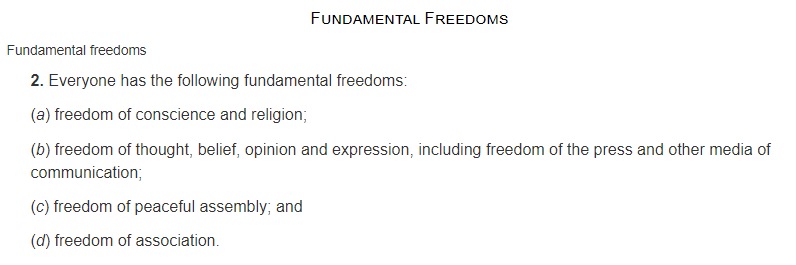 加拿大人的信仰自由完全不需要特鲁多总理重申,因为宗教信仰自由和人权是受到加拿大宪法法案(1982)《加拿大权利与自由宪章》保护的宪法权利。根据该宪章第二条,每一个人享有以下4种基本权利: