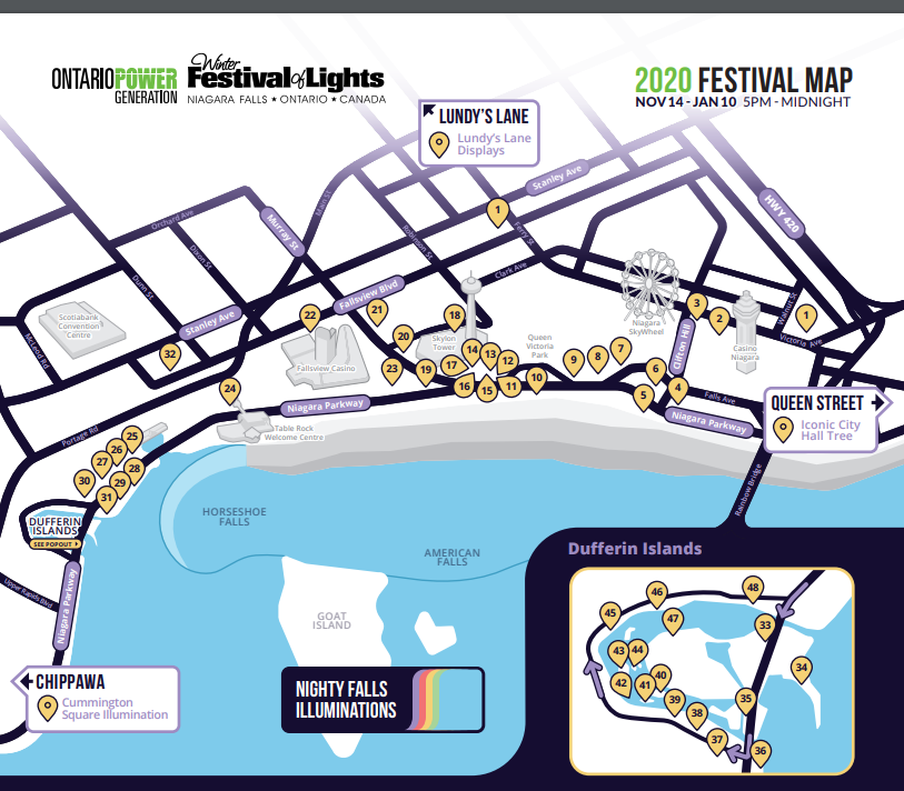 2020尼亚加拉冬季灯光节 Posted By: Xin Yi Zhang 2020-12-24 有将近40年历史的尼亚加拉冬季灯光节(Winter Festival of Lights)将一直开放到2021年1 月10日。今年受疫情影响,从12月26日起安省实行封省,灯光节是户外活动,不受影响,但是电影院、展览馆、游乐场等都将会关闭,餐馆只接受送餐。参观时请保持社交距离、戴口罩。游客也可以乘车观赏。由于观灯游客众多,汽车行驶速度非常缓慢,如果只是途径尼亚加拉,应尽量走QEW,避免尼亚加拉市内道路。 下面的游览地图取自尼亚加拉冬季灯光节的网站: Post Views: 93 1