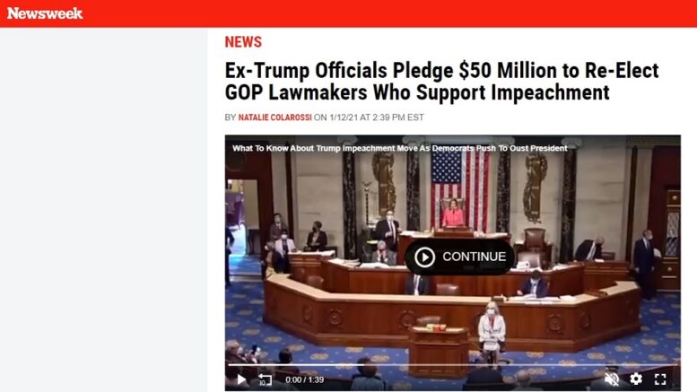 据《新闻周刊》2021年1 月12日报导,一个新的组织Republican Accountability Project(共和党问责项目,简称RAP)的主席宣称,他们要追究特朗普总统在1月6日国会骚乱事件中的责任。为此,一些反对特朗普的活动家和前特朗普幕僚成员一起筹集了5000万美元,向对弹劾特朗普总统投下赞成票的共和党众议员提供资金。